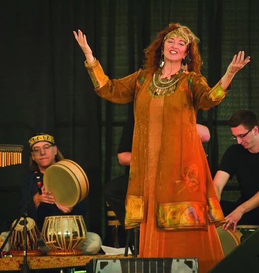 …imagine a woman in a shimmering copper gown edged in brilliant gold, hair blazing, eyes on fire…and she says, “I hear a drum in my soul’s ear coming from the depth of the stars…”